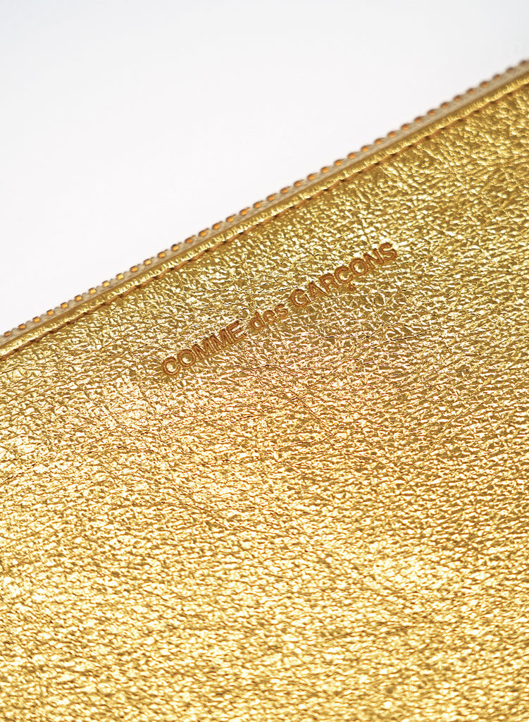 The Comme des Garçons classic pouch is an iconic and understated staple. This bolder iteration is constructed from metallic textured leather and features a subtle debossed logo and gold hardware.