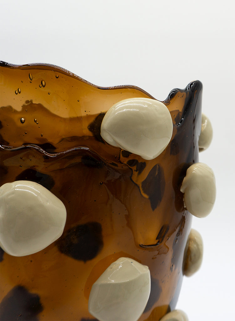 Designed by Gaetano Pesce in 2004, the Nugget Vase is formed from a soft resin. A clear brown vessel is covered in abstract cream spots and sits on an orange base.