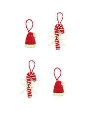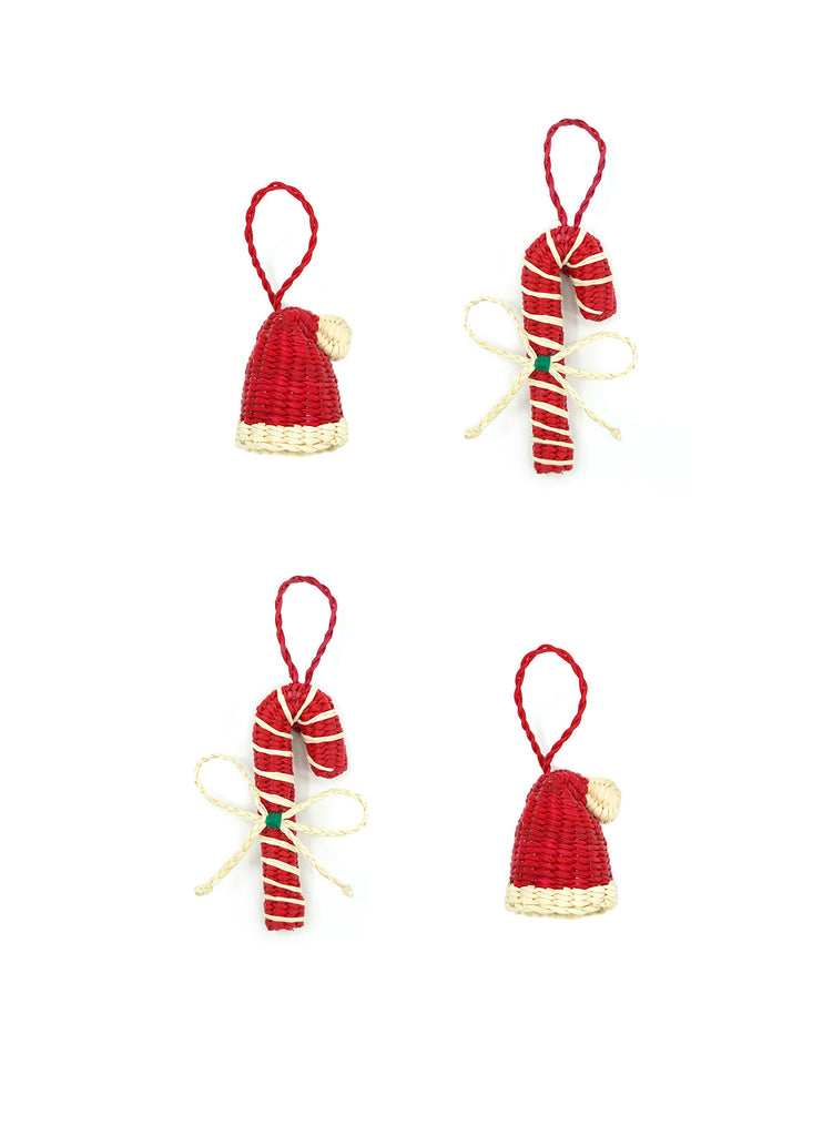 A set of four Christmas ornaments, handmade by women artisans in Colombia using a traditional weaving technique from the region. The leaves of the Toquila palm have been dyed and intricately interwoven to form the festive santa hat and candy cane designs.