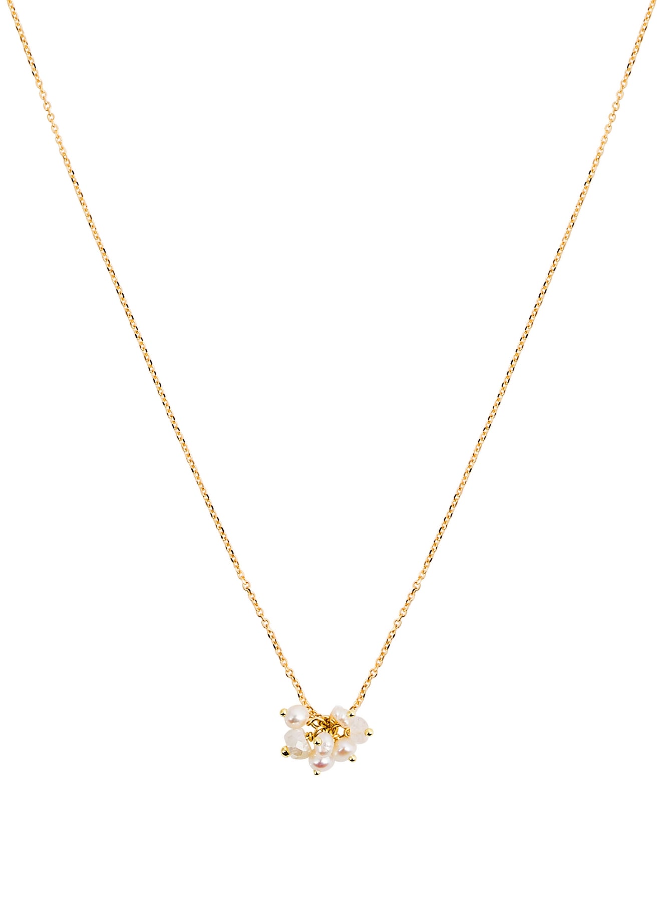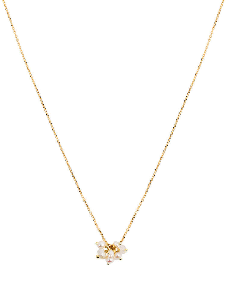 18ct yellow gold fine chain necklace with single cluster of white seed pearls and moonstone.