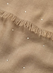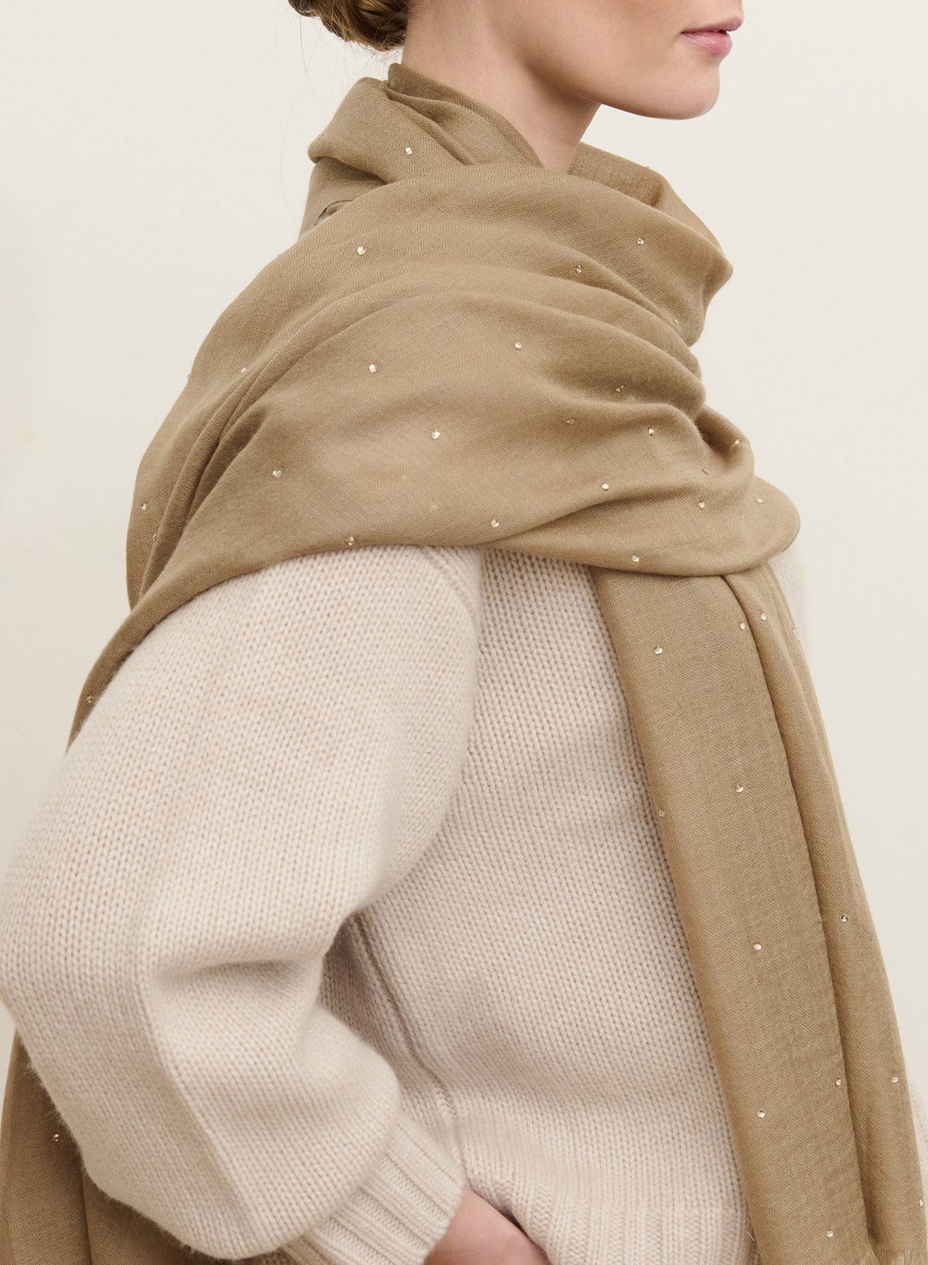 A fine, diamond jacquard weave scarf in soft camel pure cashmere, embellished all over with sparkling pale golden Swarovski crystals. Perfect for event dressing or elevating the everyday.