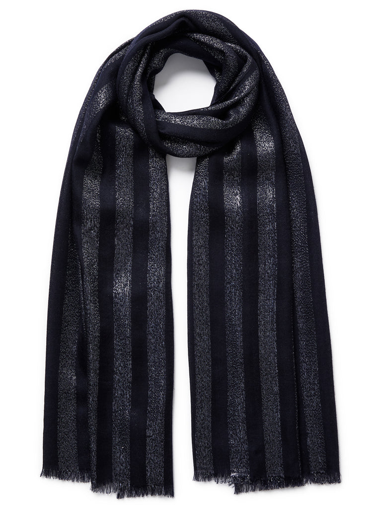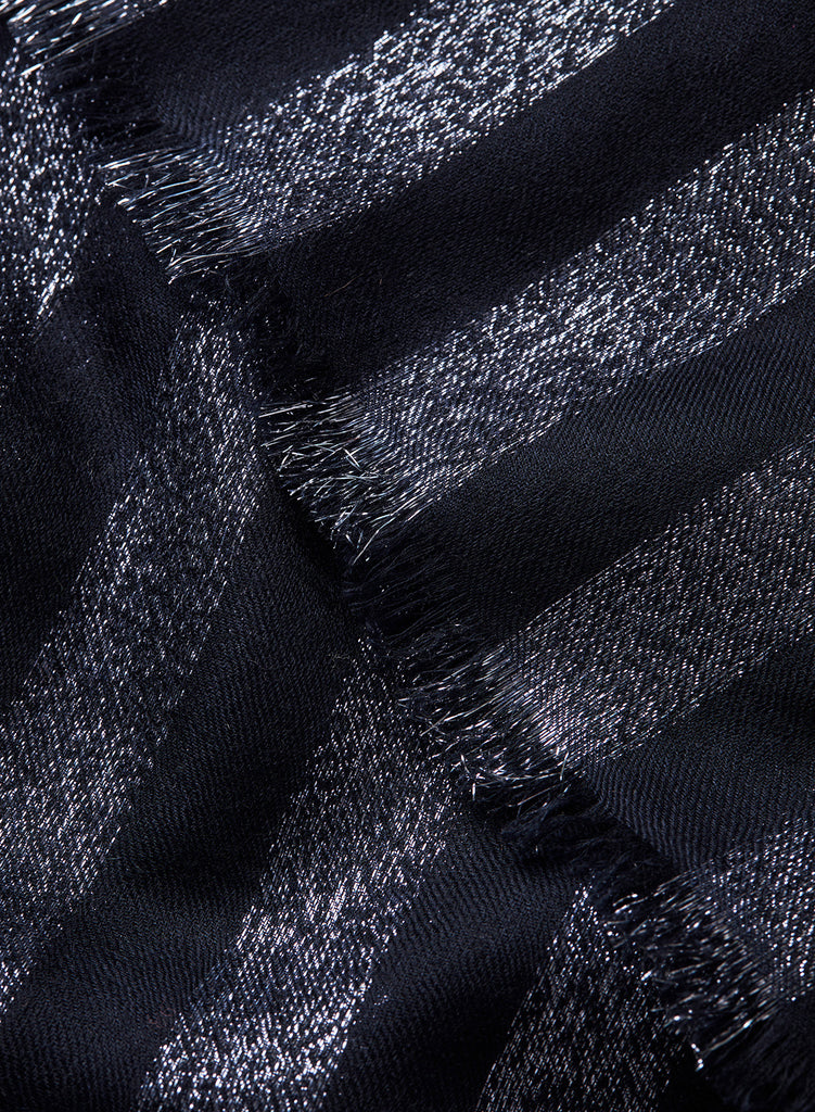 Beautifully soft navy cashmere glistens with graphic stripes of silver metallic Lurex - the ultimate after-dark accessory.