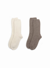 Two pairs of cosy cashmere socks, perfect for lounging at home and adding a layer of warmth in colder months. Pure cashmere is knitted in Scotland to create their plush ribbed design.