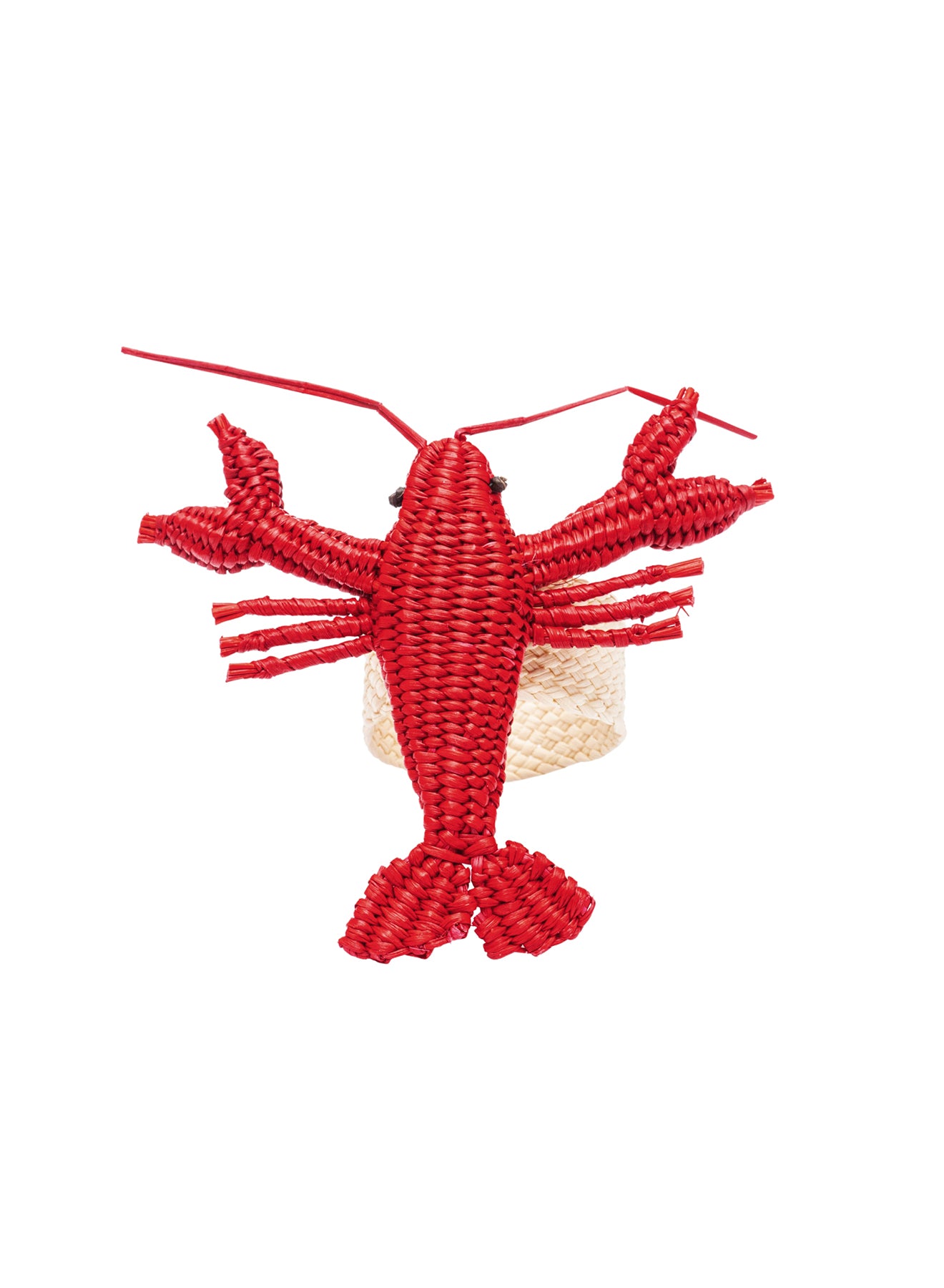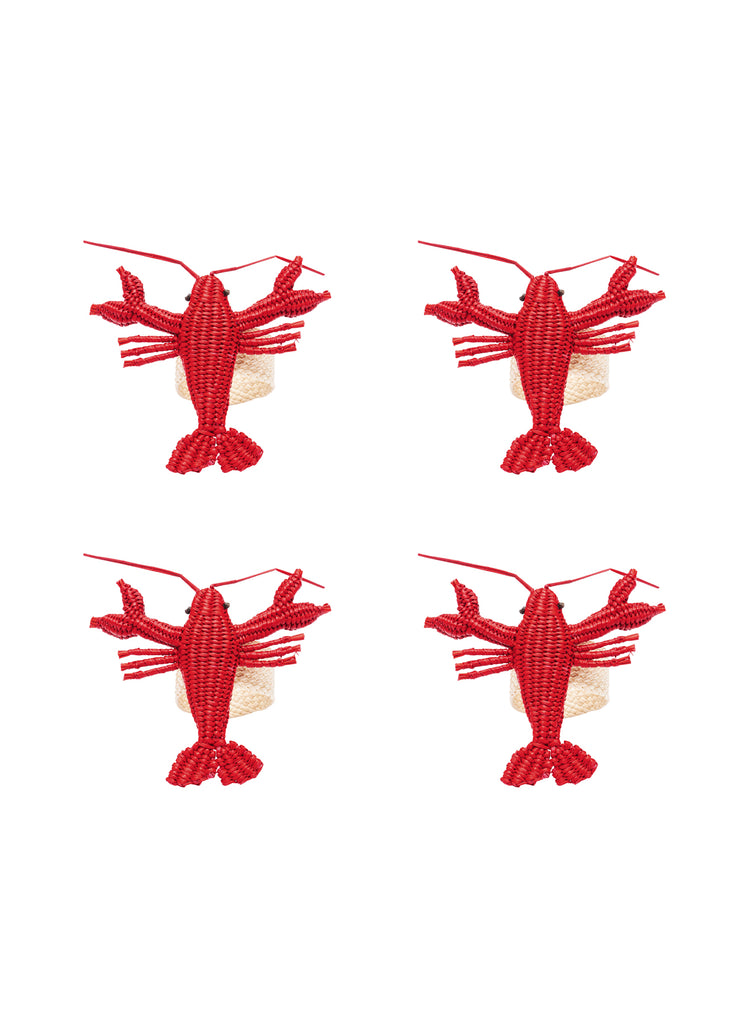 A set of four napkin rings, handmade by women artisans in Colombia using a traditional weaving technique from the region. The leaves of the Toquila palm have been dyed and intricately interwoven to form the playful red lobster design.