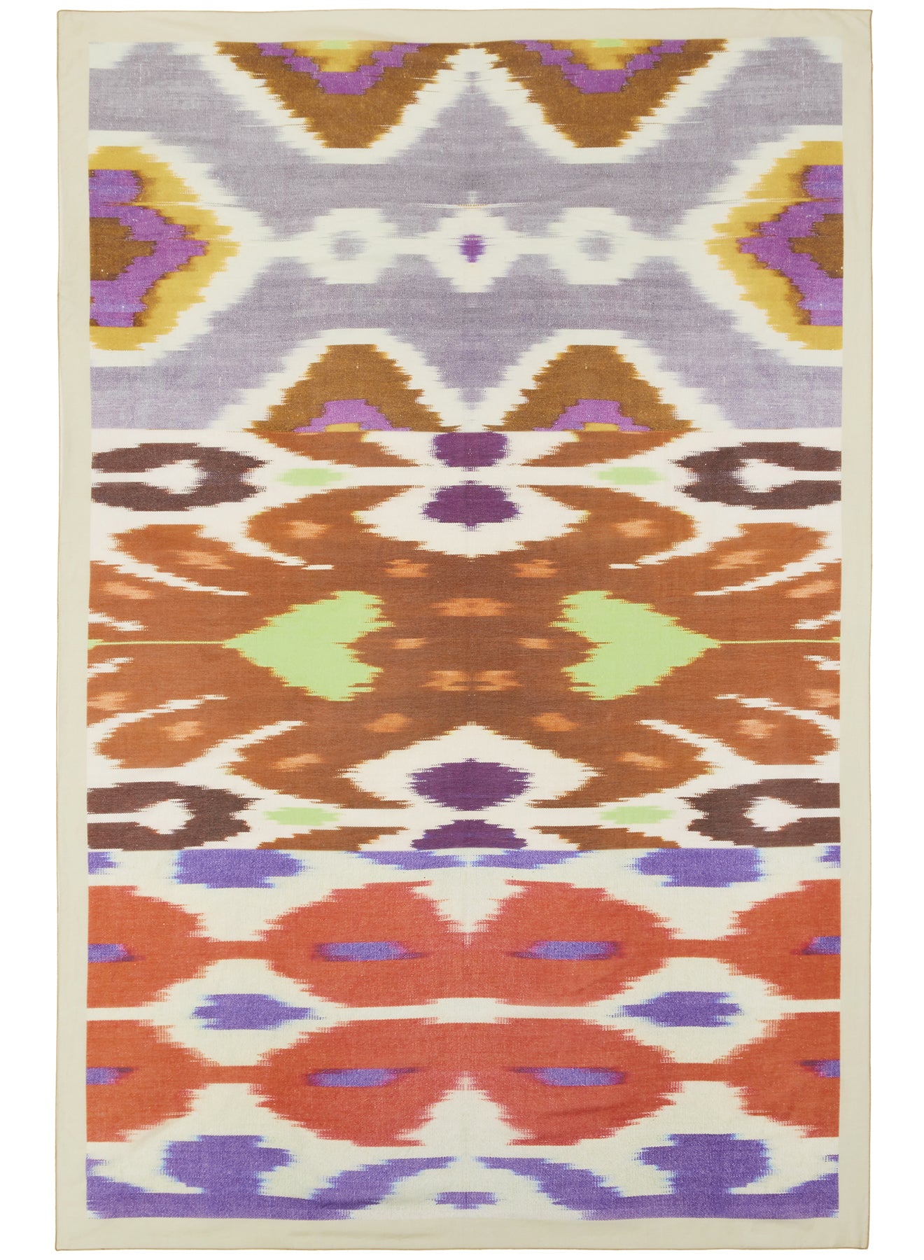 A trio of contrast ikat designs in orange, purple, green and neutrals create this holiday-ready design. This beach cover-up can be styled a multitude of ways as a skirt, top or dress. Framed with a pale green border and printed on a weightless silk cotton-blend with baby locked hems.