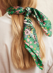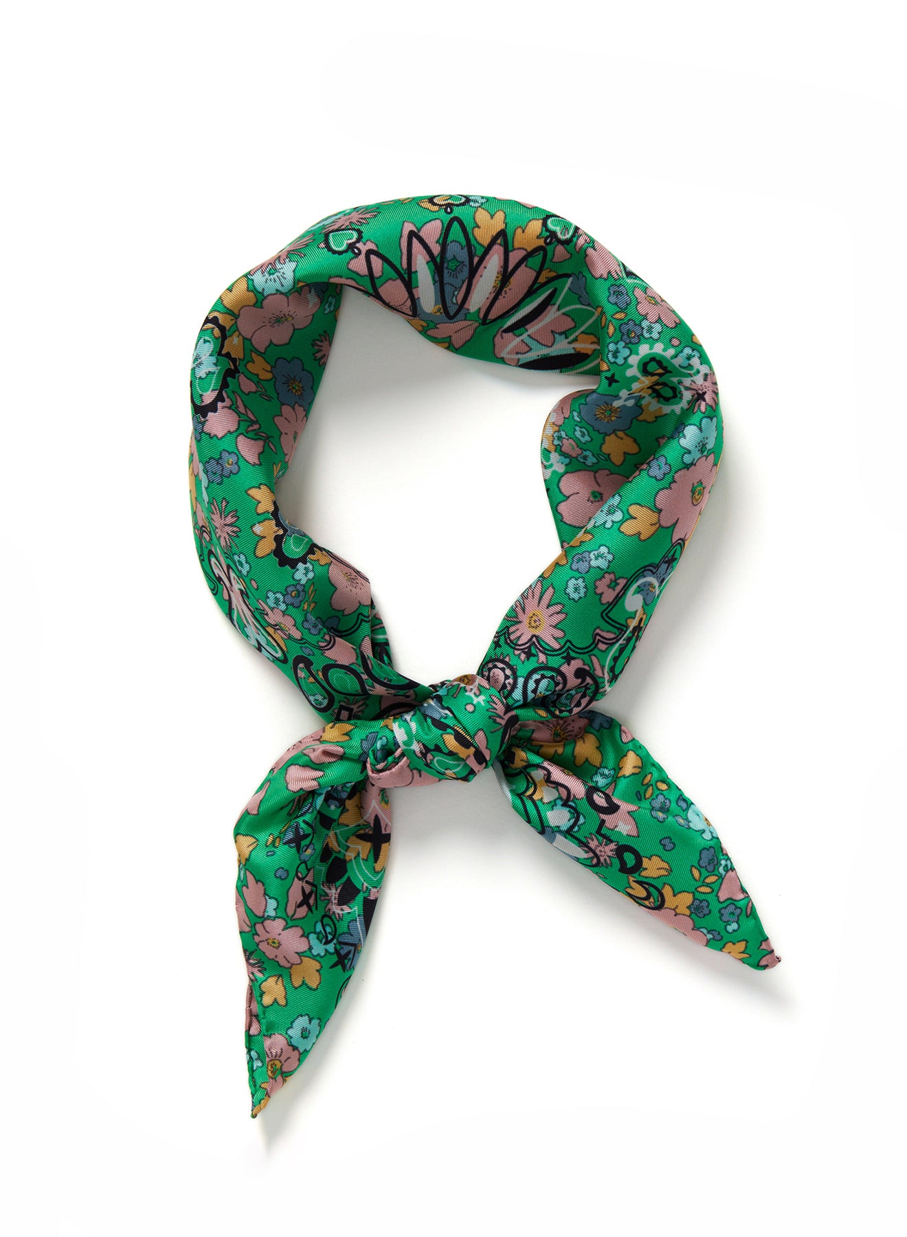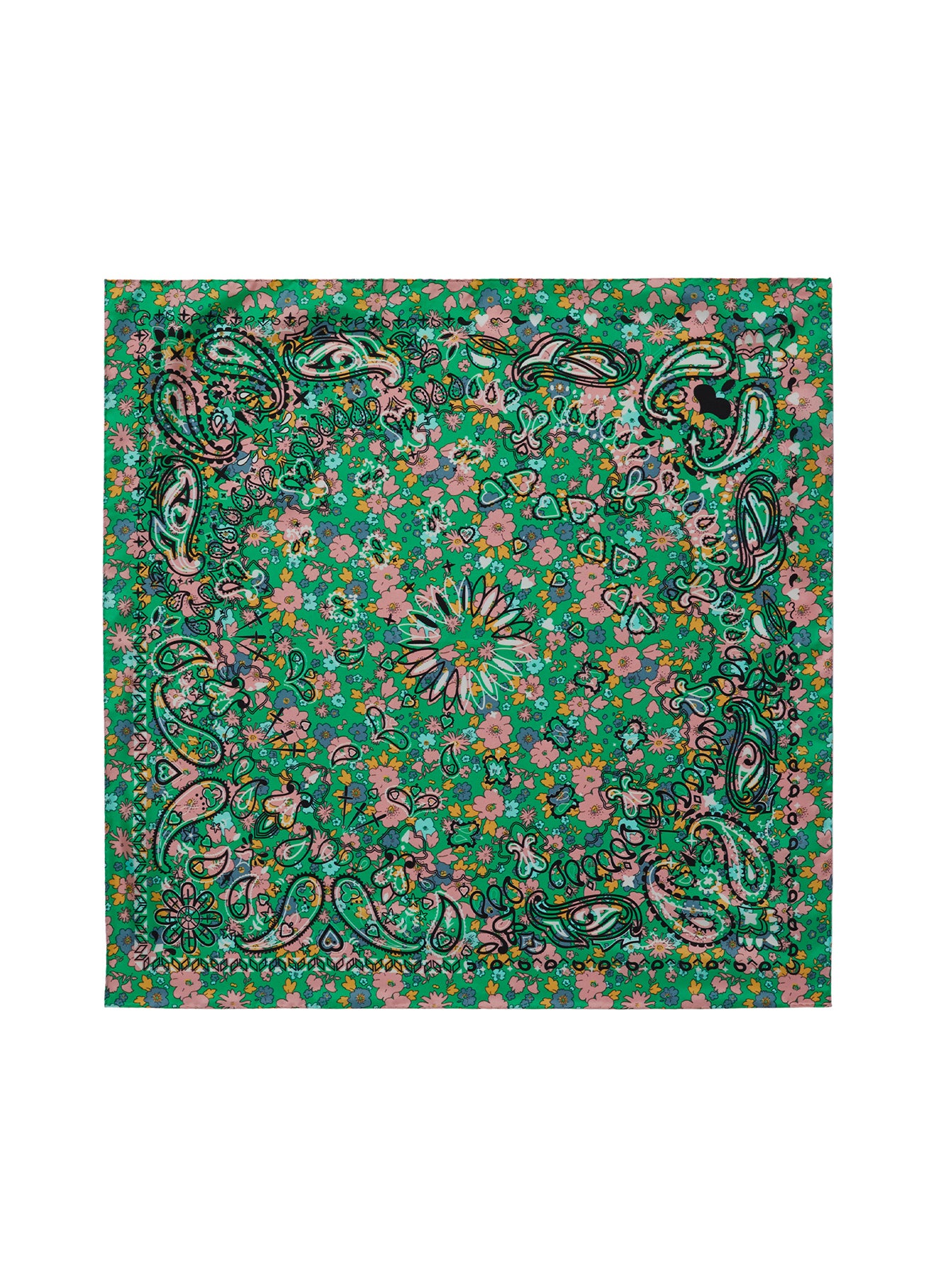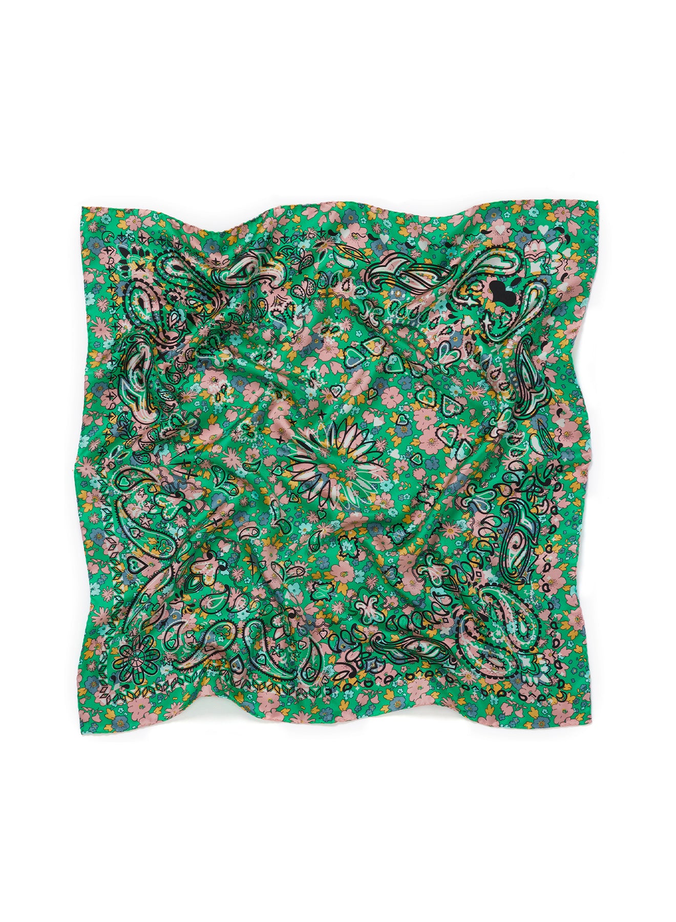 Vintage ditsy florals in a palette of green, pink, blue and orange are layered with a bold black and white bandana design on pure silk twill. Knot it around your neck, the handles of your tote or in your hair.
