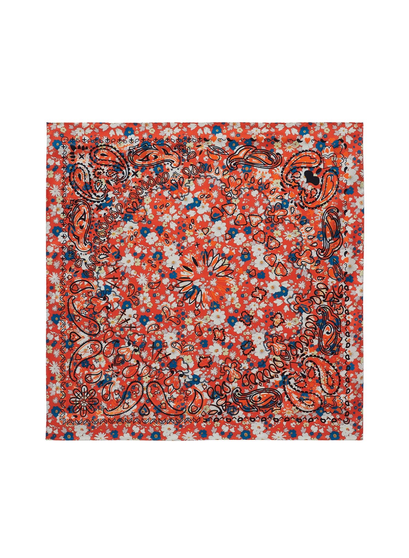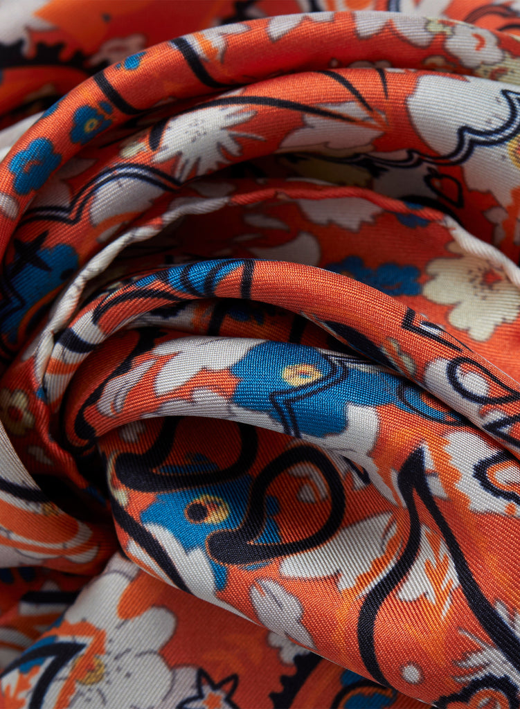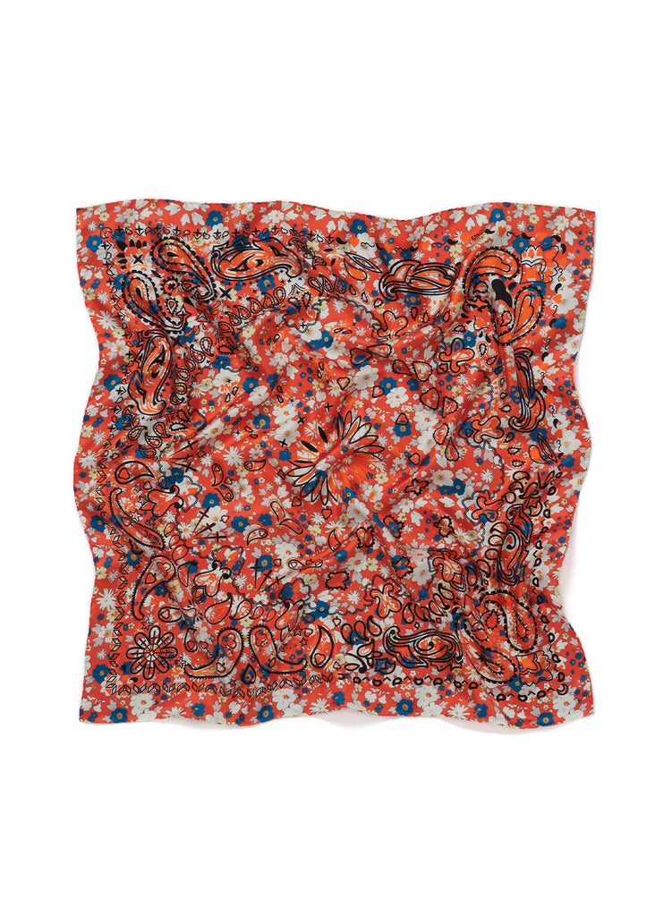 Vintage ditsy florals in a palette of red, blue and off-white are layered with a bold black and orange bandana design on pure silk twill. Finished with hand-rolled hems. Knot it around your neck, the handles of your tote or in your hair.