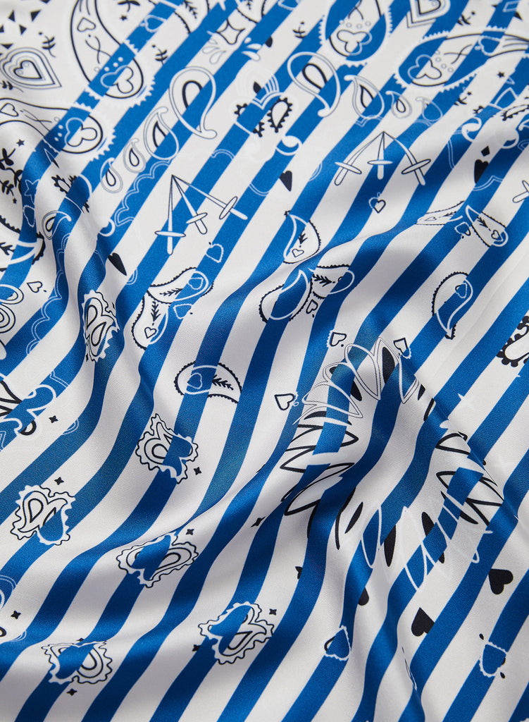 Blue and off-white sailor stripes are layered with a contrast monochrome bandana design to create a fresh twist. Printed on lustrous pure silk twill with impeccably hand-rolled hems.