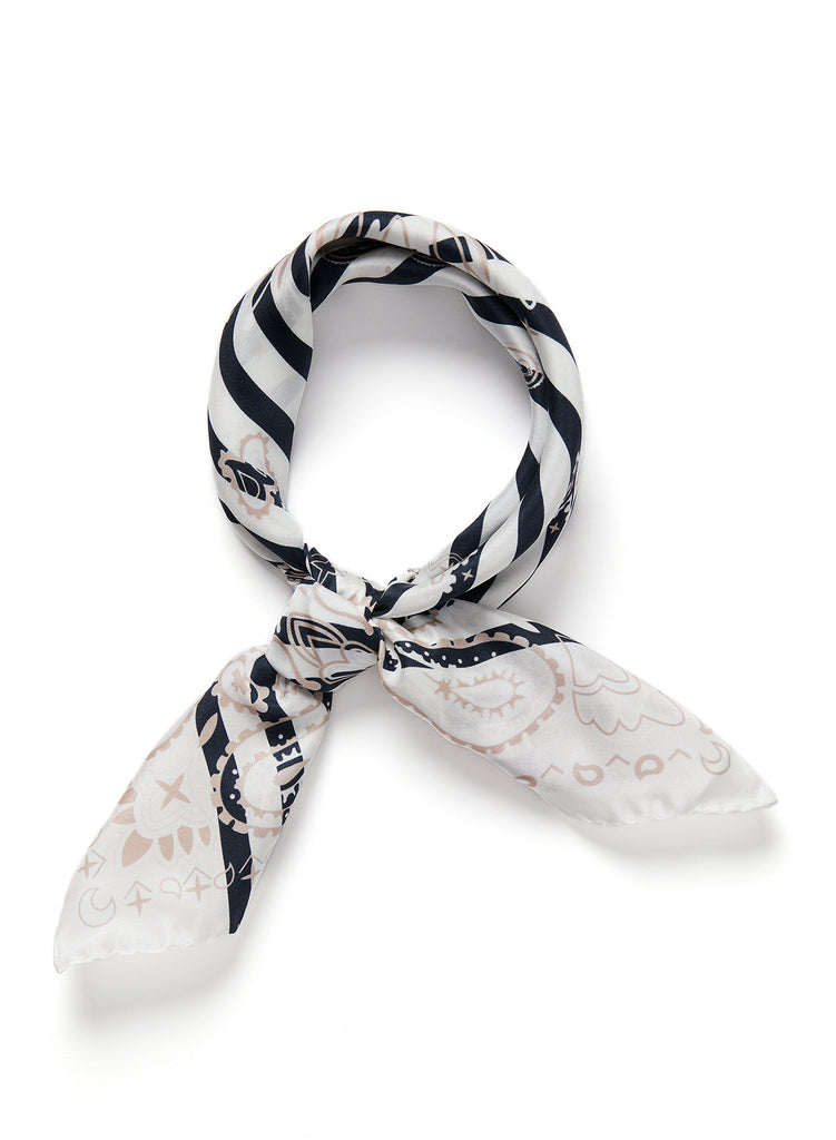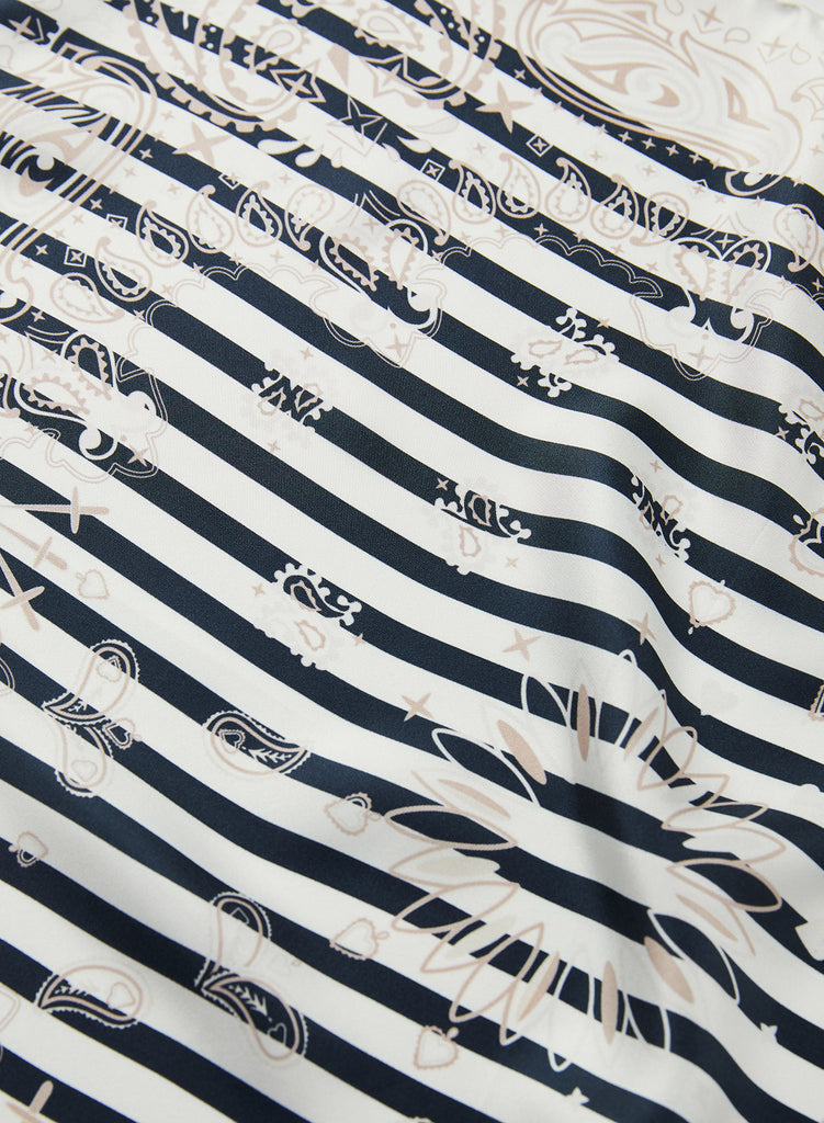 Black and white sailor stripes are layered with a contrast beige bandana design to create a fresh twist. Printed on lustrous pure silk twill with impeccably hand-rolled hems.