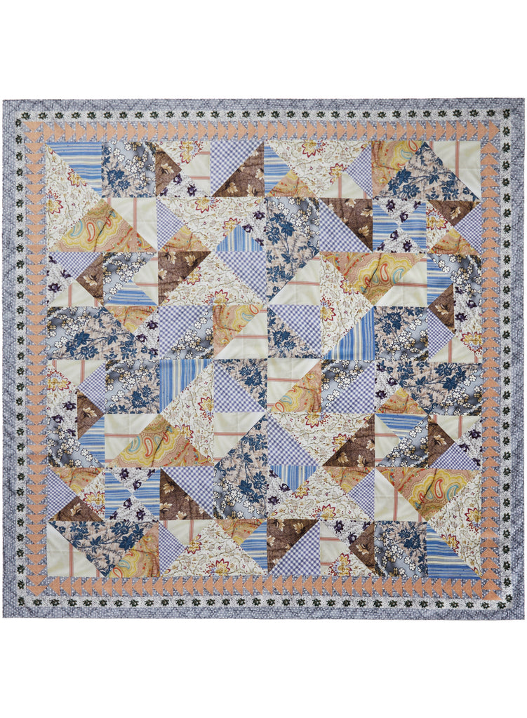 Triangles of quilted vintage fabric are patchworked to create this homespun yet polished print in blues, pinks and neutrals. Printed on lustrous pure silk twill with impeccably hand-rolled hems. The intricate design is accented with warm neutrals, so pairs perfectly with tonal beige, camel and brown separates. The intricate design is accented with warm neutrals, so pairs perfectly with tonal beige, camel and brown separates.