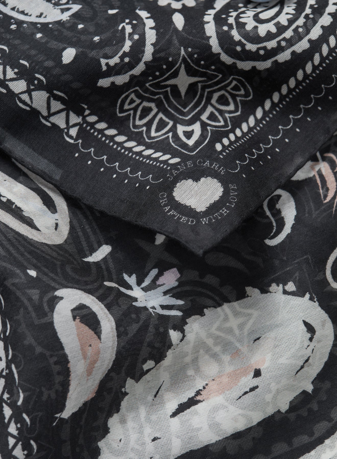 Diagonal rays of contrast bandana print create this design, from classic to ditsy floral to painterly brushstrokes. The black background is finished with white, grey, blush and purple accents. Printed on a relaxed, lightweight cotton and silk-blend with impeccably hand-rolled hems. A modern twist on the timeless accent, this style is endlessly versatile.