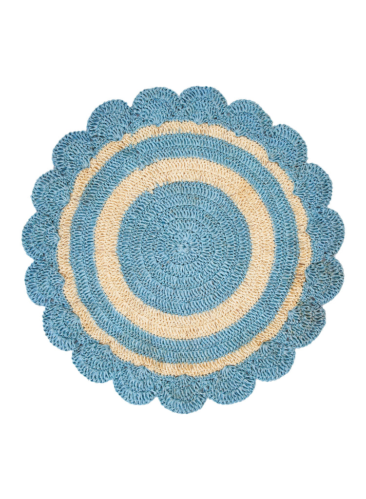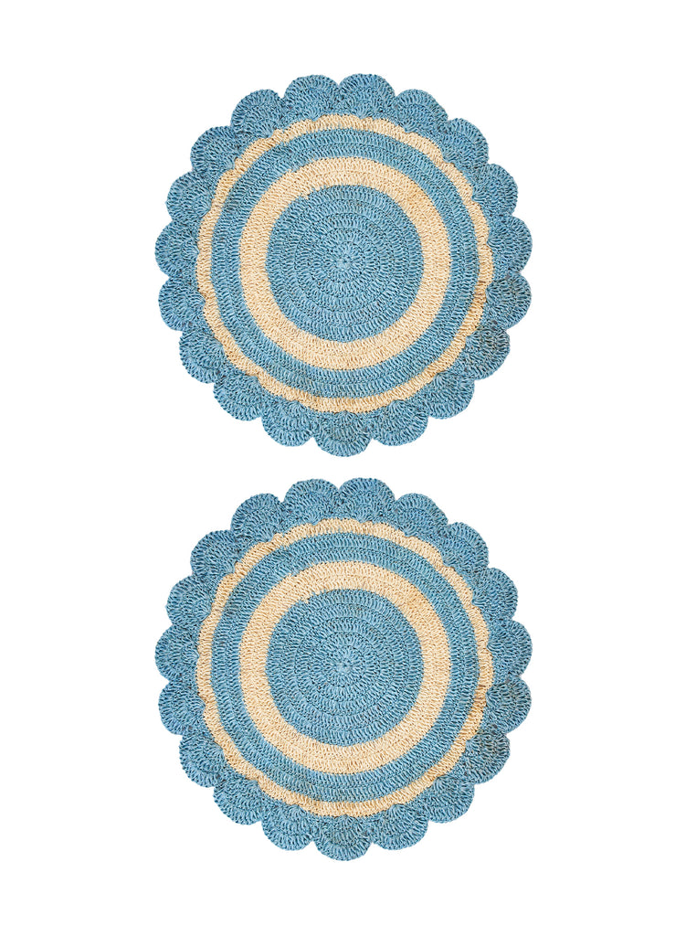 These stunning woven placemats are made by artisans in Colombia. They use a crochet technique to weave figue fibres, an Andean plant known for its rich texture and strength. This forms a ring design in light blue and natural, finished with a scalloped edge.