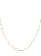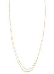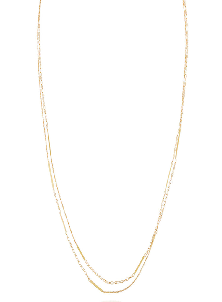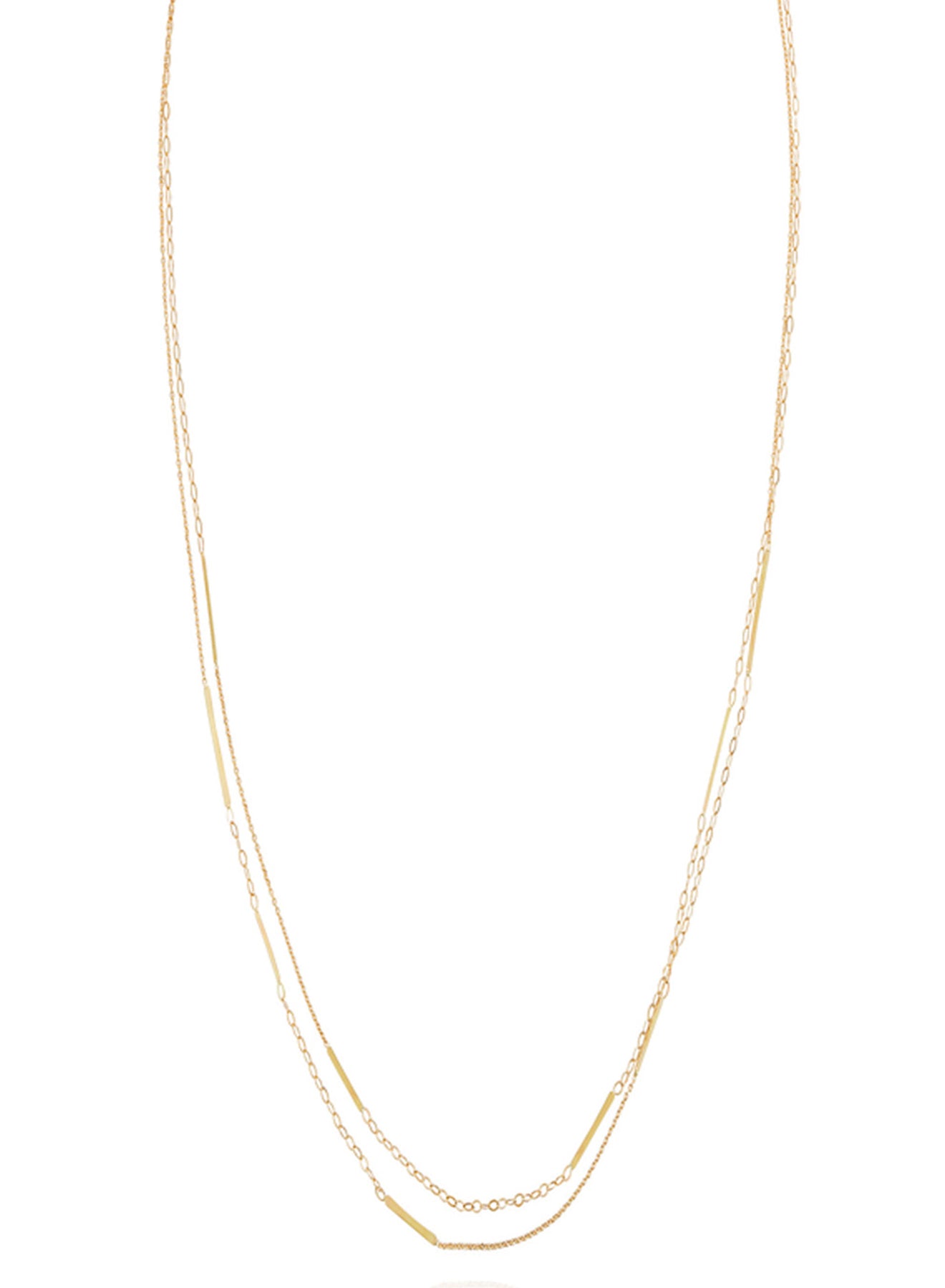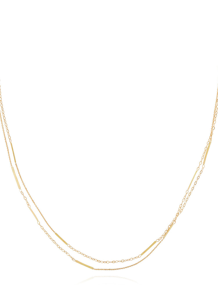 18ct yellow gold long chain necklace is made by interspersing a mix of fine and oval chains with gold bars. There are 17 inserted hand-made gold bars.