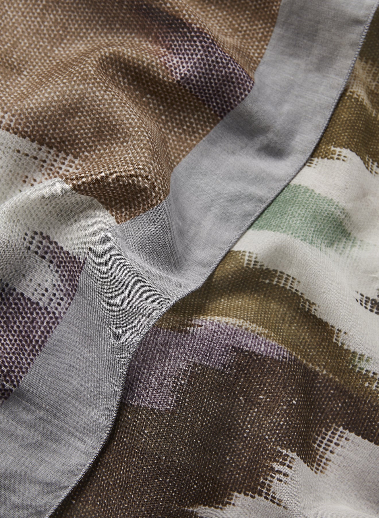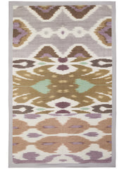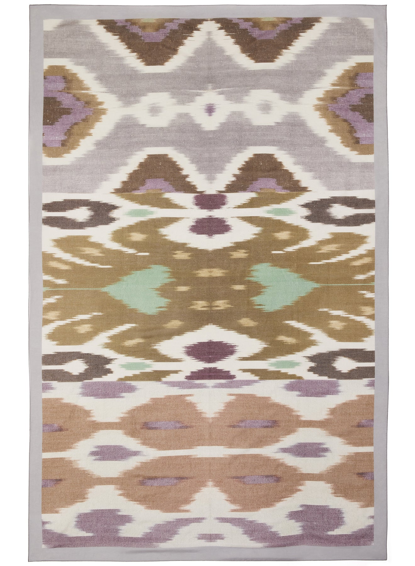 A trio of contrast ikat designs in muted purple, green, grey and brown create this holiday-ready design. This beach cover-up can be styled a multitude of ways as a skirt, top or dress. Framed with a soft grey border and printed on a weightless silk cotton-blend with baby locked hems.Â