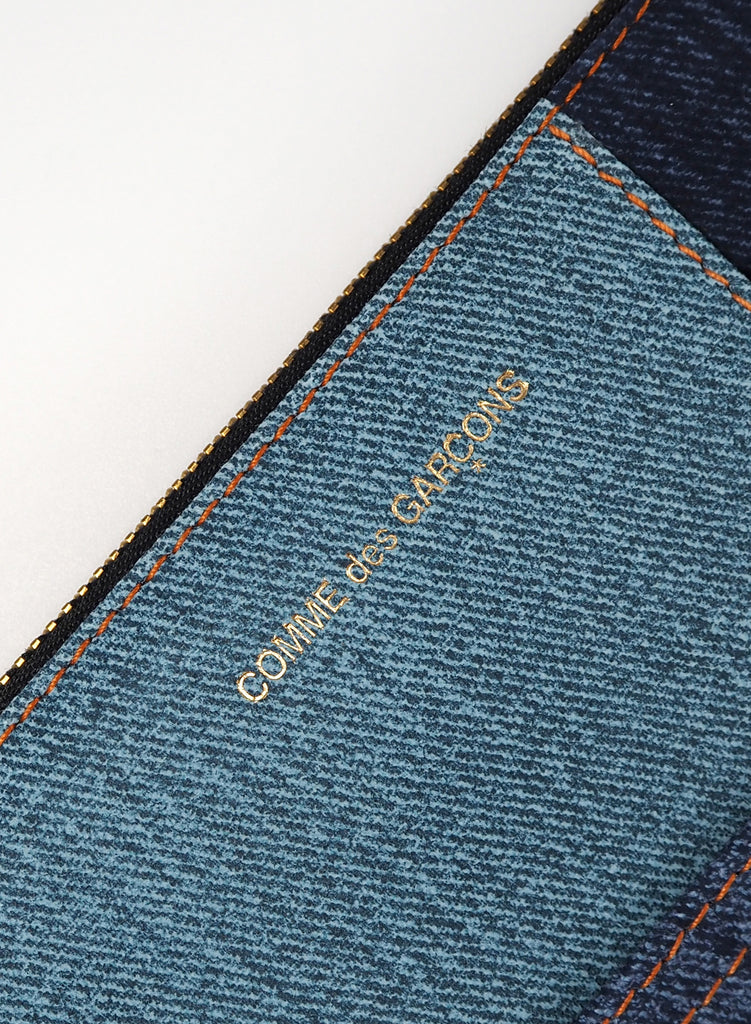 The Comme des Garçons classic pouch is an iconic and understated staple. The denim design is printed on lambskin leather to create a patchwork design with pockets on the front. It features a subtle gold foil embossed logo, gold hardware contrast orange stitching.
