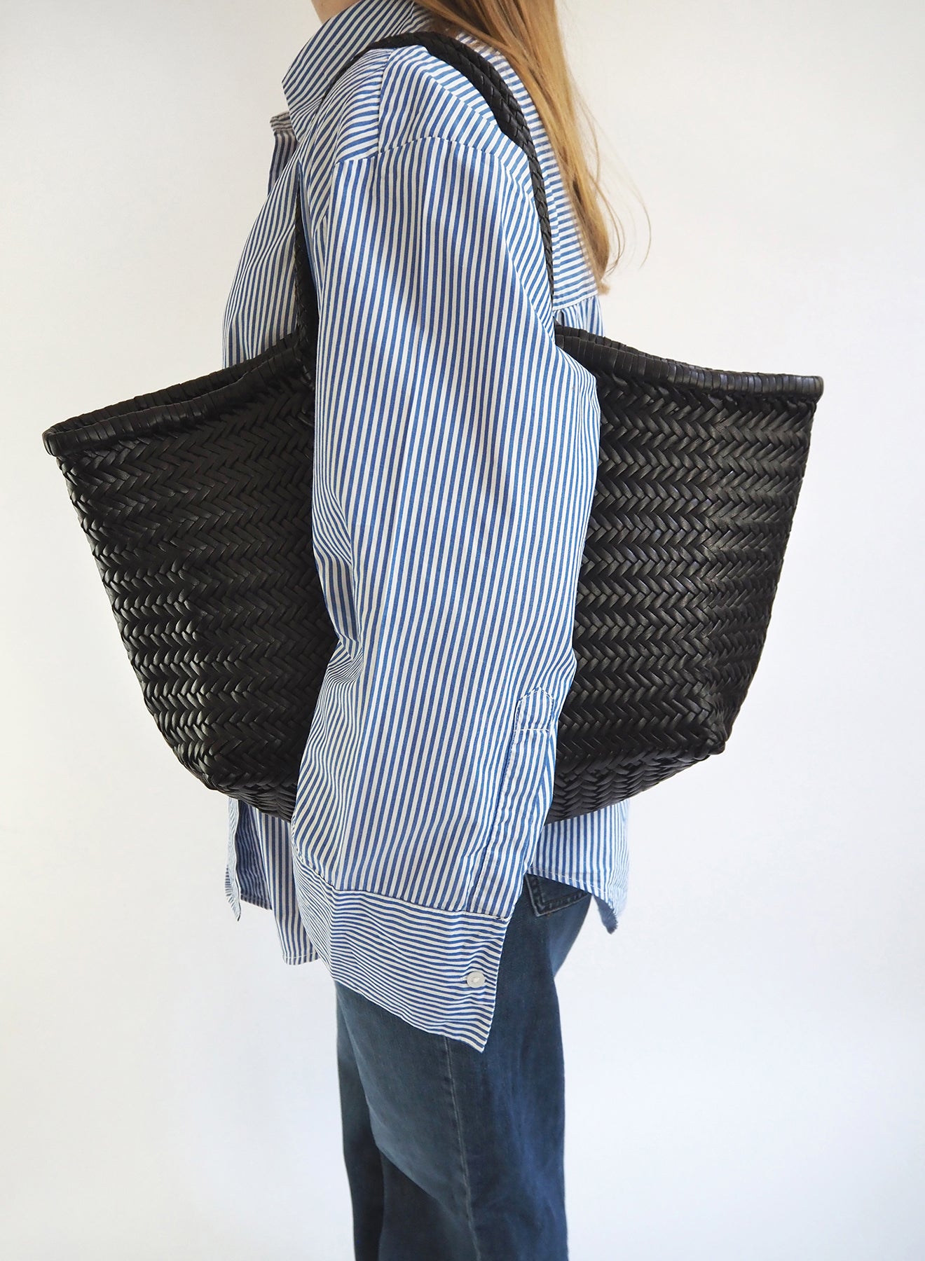 This spacious basket bag is hand-woven with a diagonal chevron weave and braided handles which can be be carried in the hand or on the shoulder. Practical for everyday, and the perfect holiday bag.