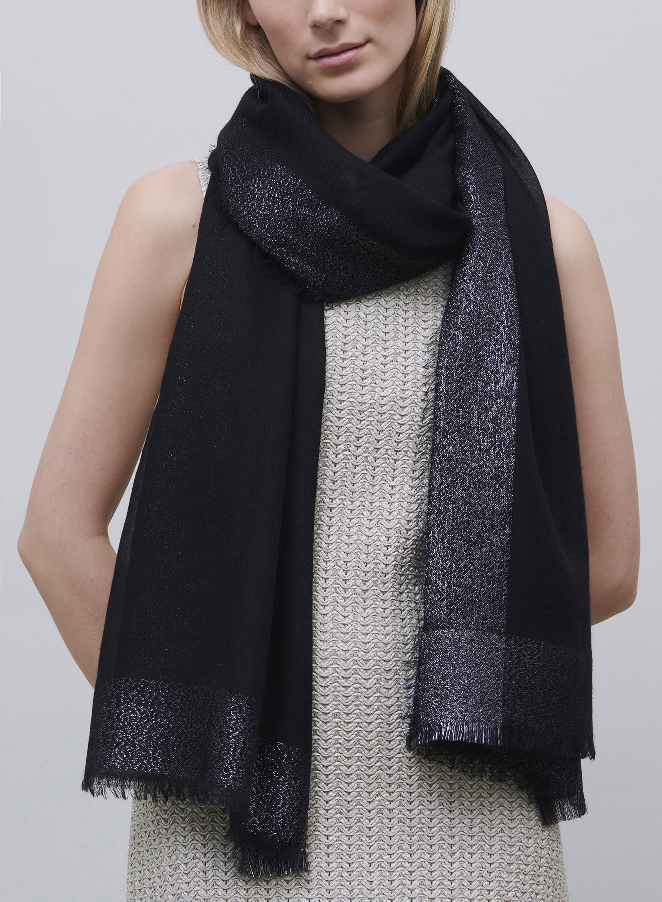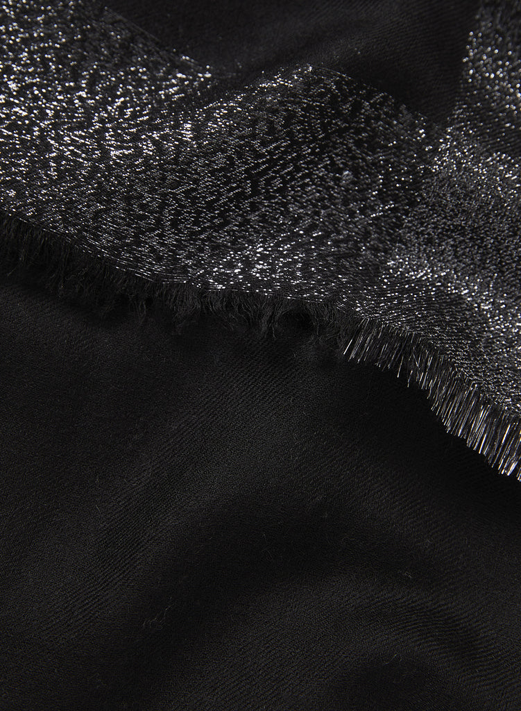 Striking bands of dark silver metallic Lurex frame impossibly soft, feather-light black cashmere. Finished with delicately hand-frayed hems. It's the perfect finishing touch to occasionwear.Â
