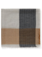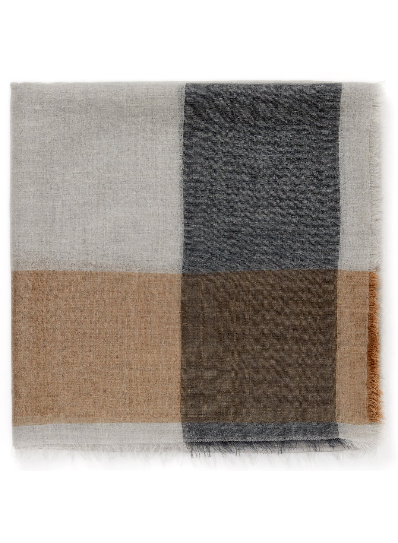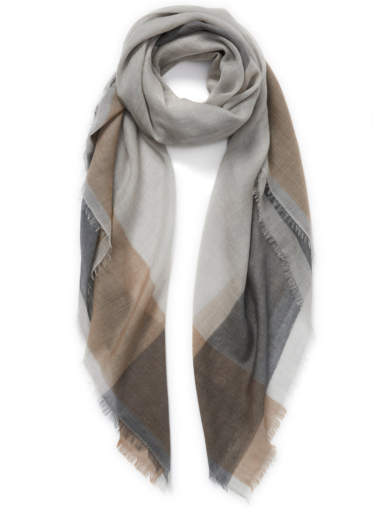 A super-soft pale grey square woven in fine pure cashmere, framed with wide taupe and dark grey borders and a delicately hand-frayed hem. Lightweight enough for all year round.