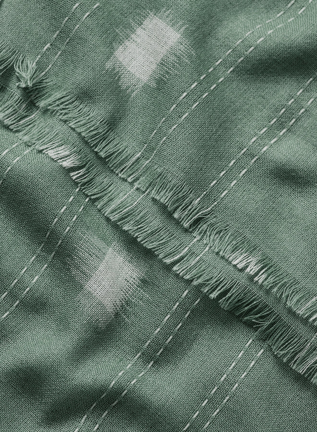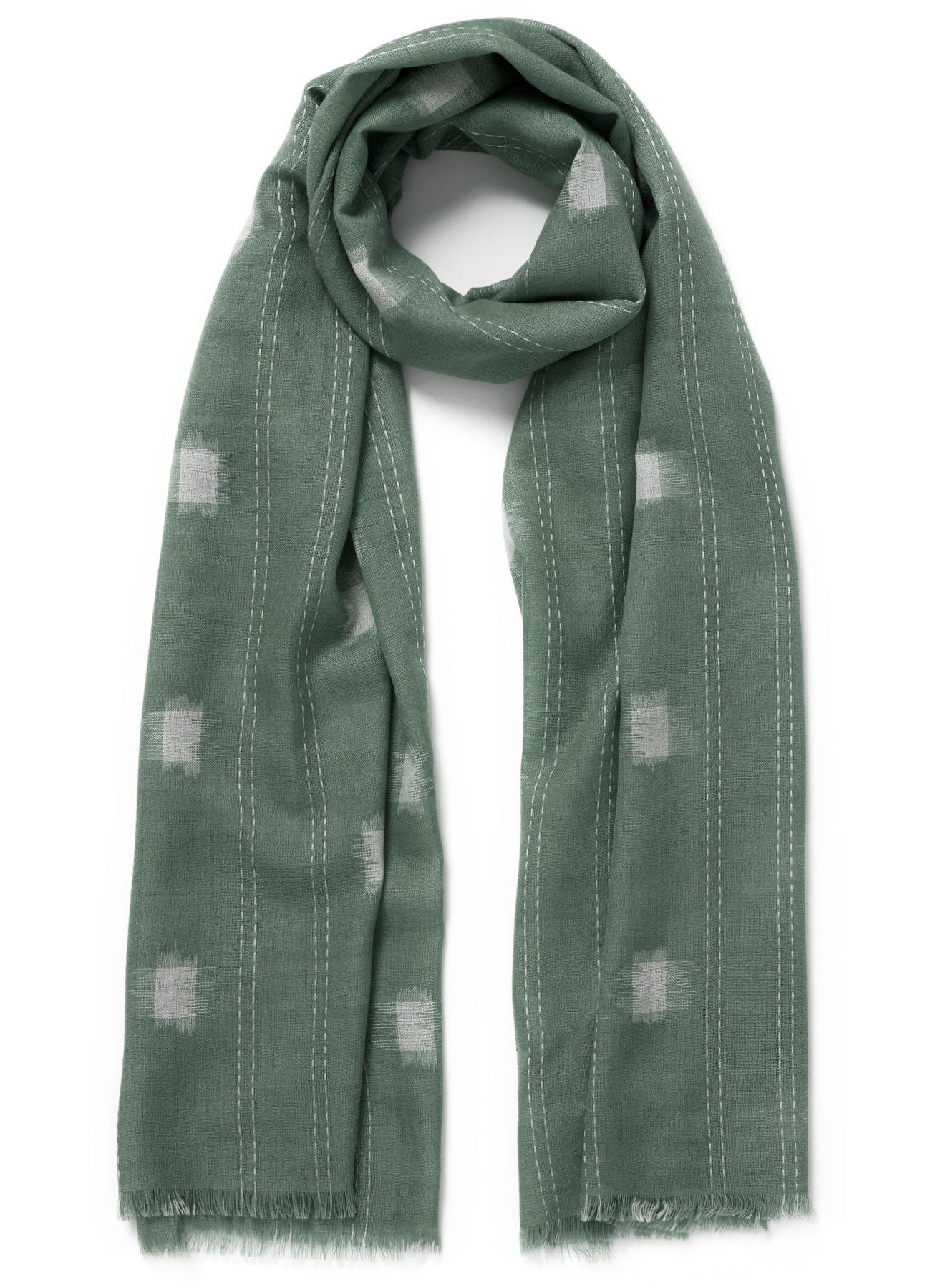 A slim, neat rectangle scarf, expertly hand-woven in the traditional Ikat method in sage green and white. It is made from pure cashmere for a soft, light and warm touch and finished with fringed ends for texture.