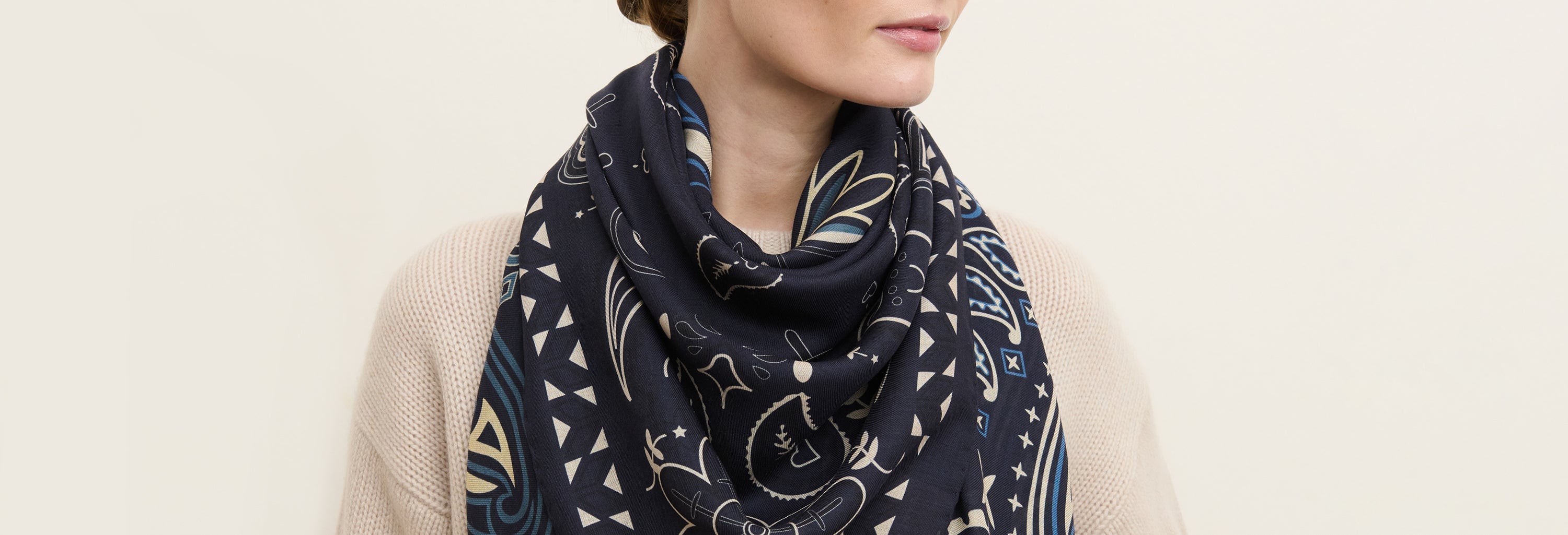 Statement prints that transform an outfit and give a focus to your look. Our printed foulards, neckerchiefs and wraps are made in Como, Italy, the home of world-class printing.