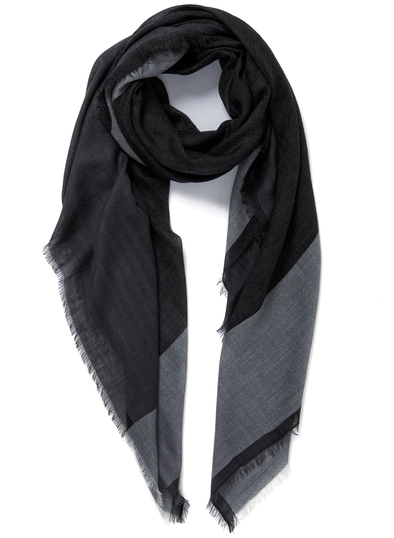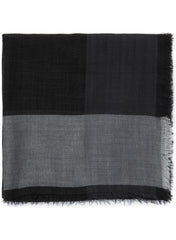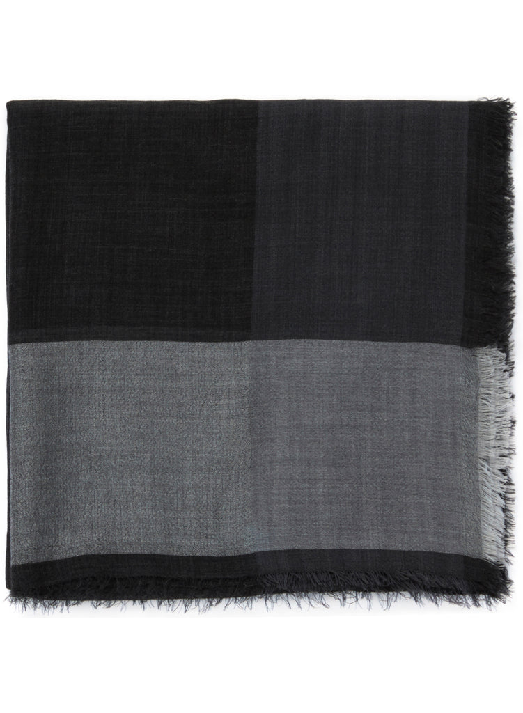 A super-soft black square woven in fine pure cashmere, framed with wide light and dark grey borders and a delicately hand-frayed hem. Lightweight enough for all year round.