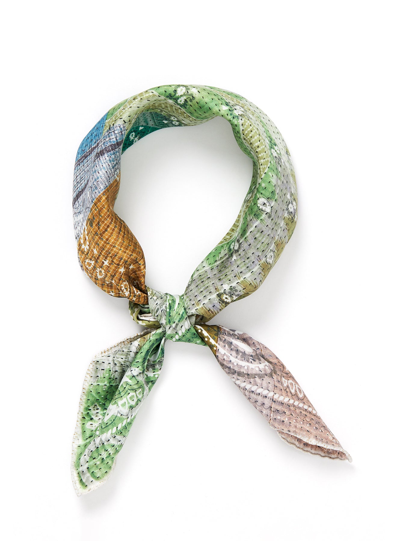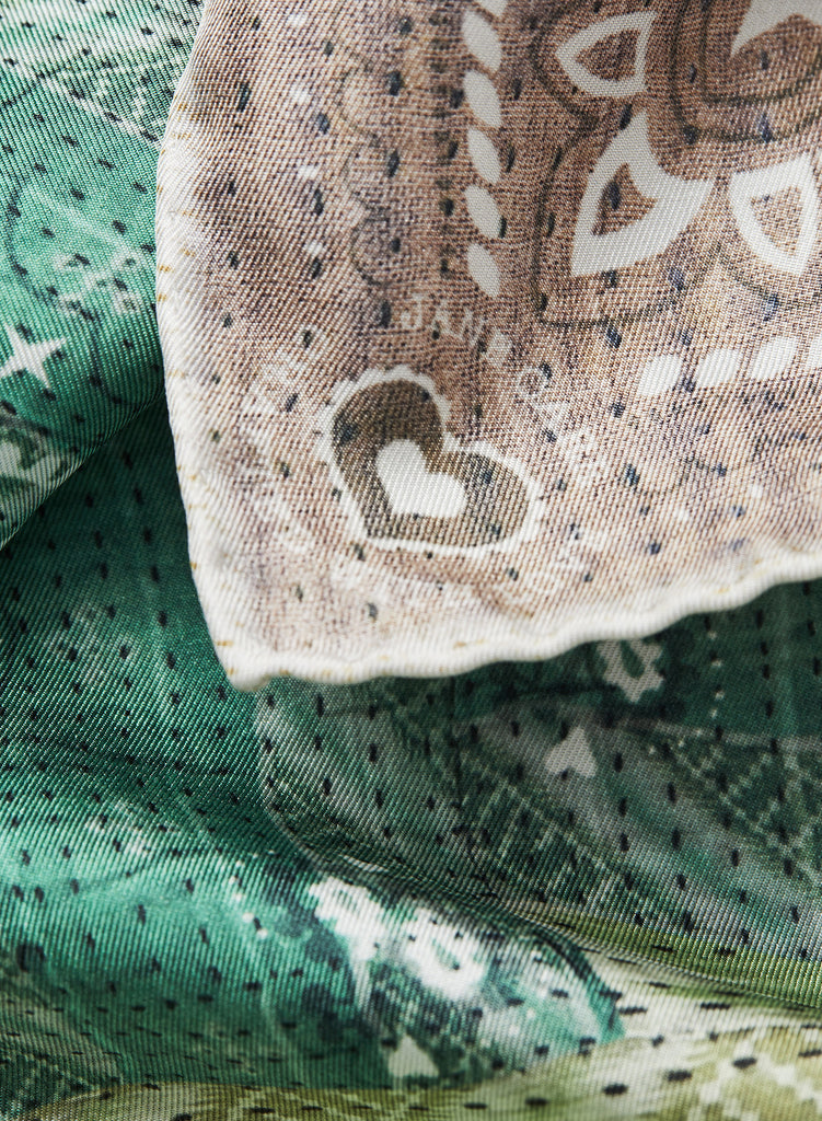 A patchwork kantha design in shades of green, blue and neutrals is layered with the iconic bandana motif. Printed on lustrous pure silk twill with impeccably hand-rolled hems. Knot it around your neck or tie it in your hair.