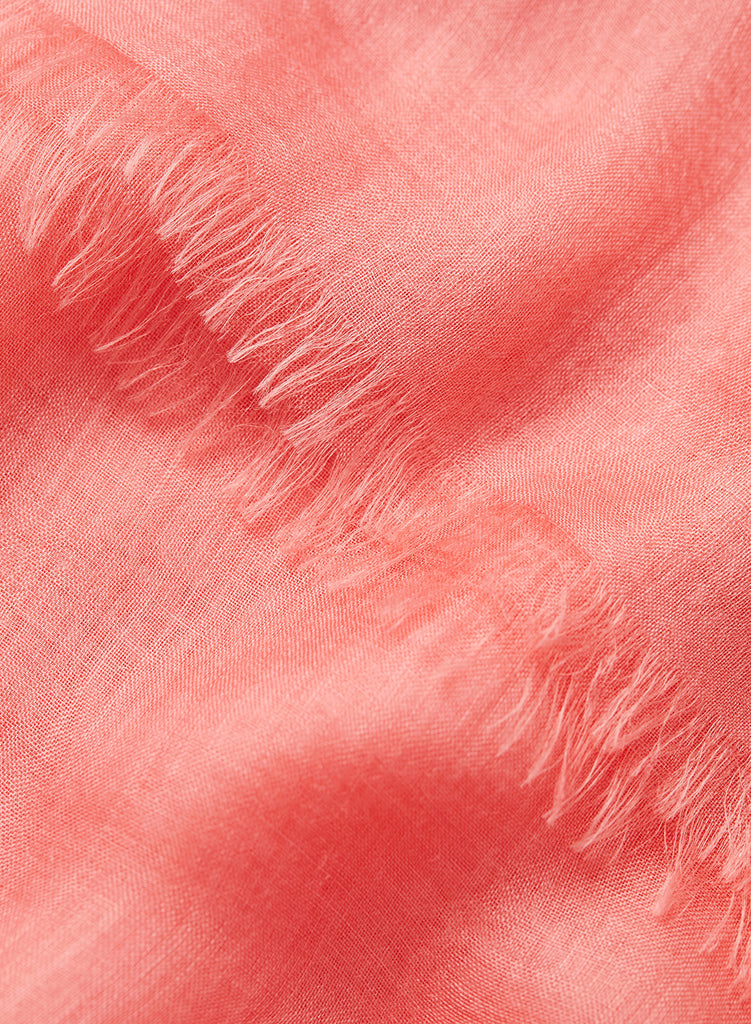 A new summer wardrobe staple, The Cloud is a sheer, whisper-weight coral pink wrap in delicate modal and cashmere. Finished with hand-frayed hems.
