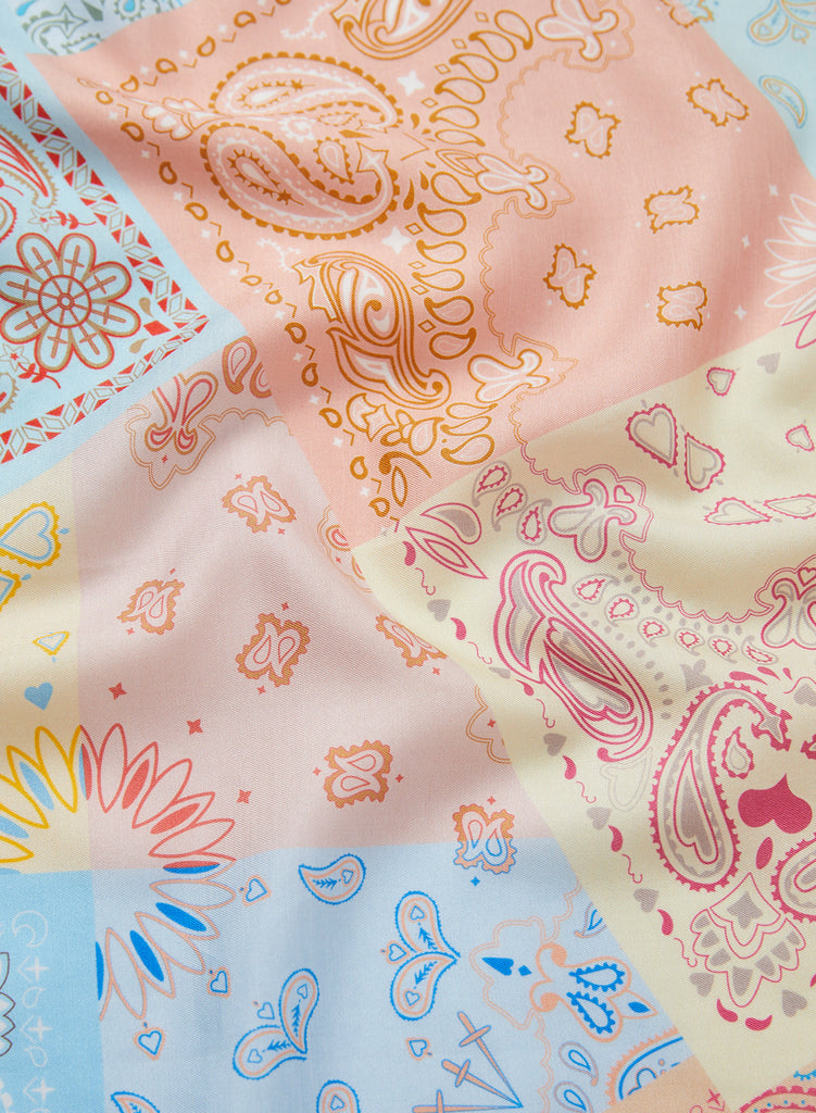 Pastel-hued bandanas with bold multicoloured motifs are neatly layered to create a lively collage design. Printed on a lightweight, semi-gloss cotton silk-blend with impeccably hand-rolled hems.