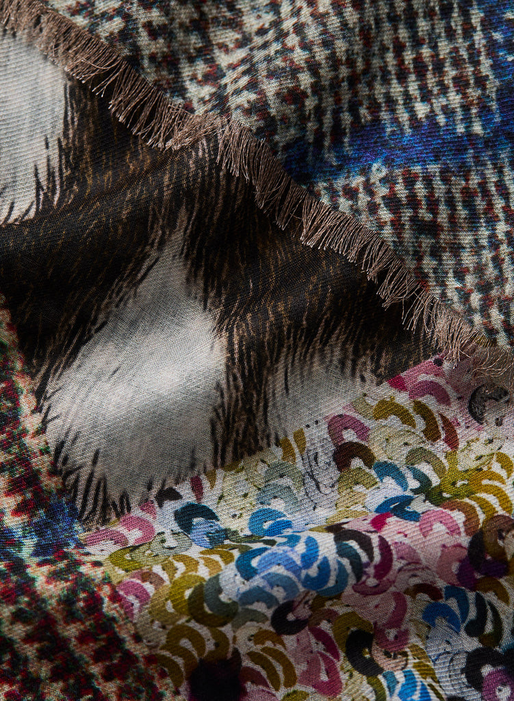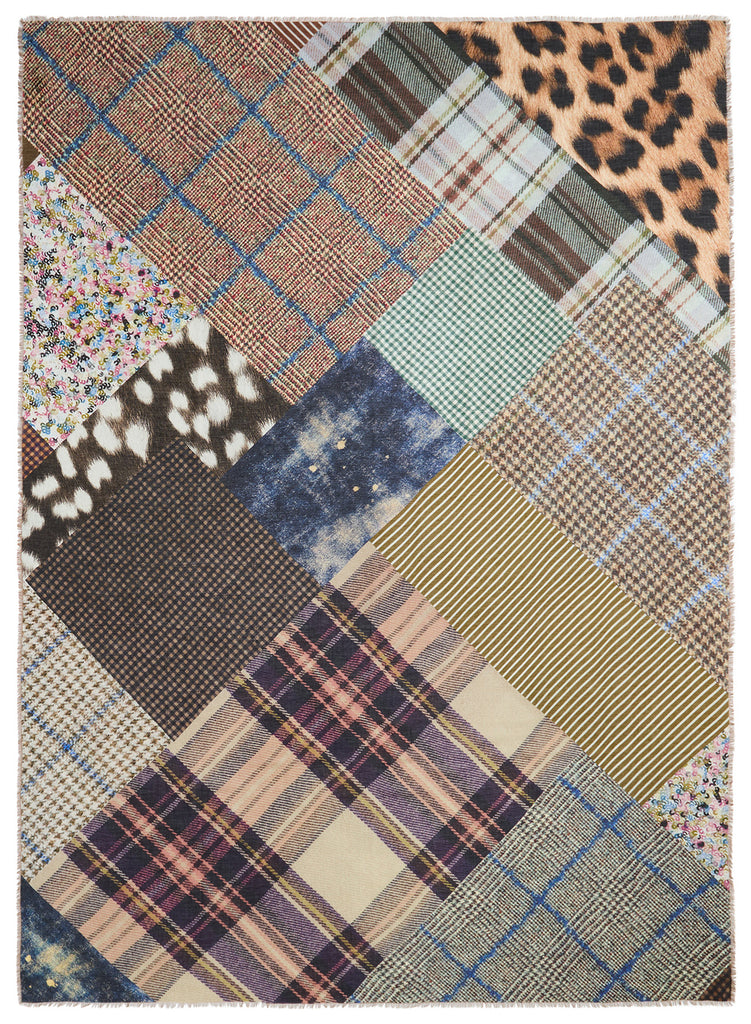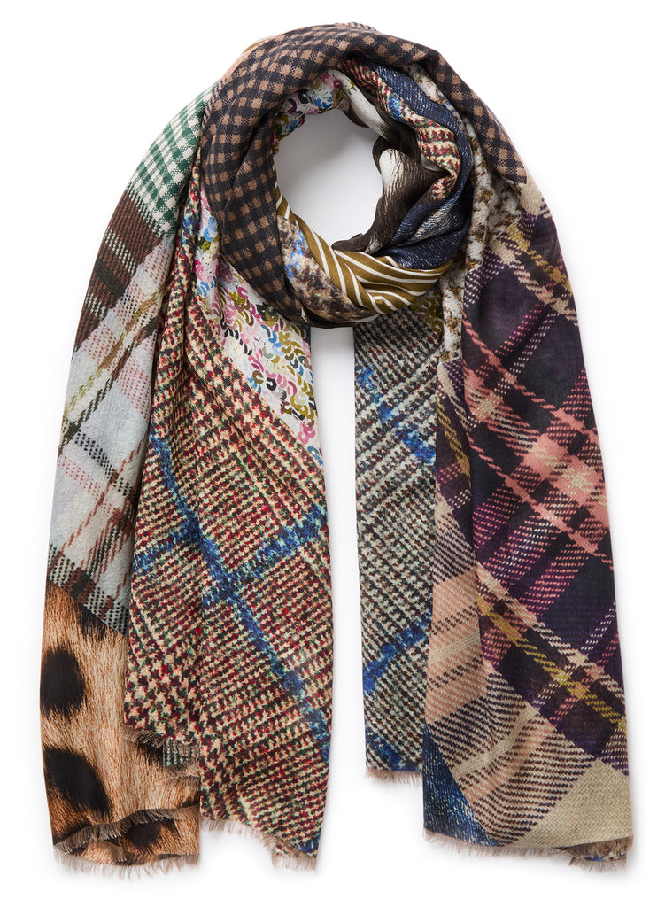 Tartans, pyjama pinstripes, leopard and sequins form a playfully eclectic patchwork print in neutral and pastel shades. Woven in super-soft modal and cashmere to create an oversized wrap, finished with hand-frayed edges.